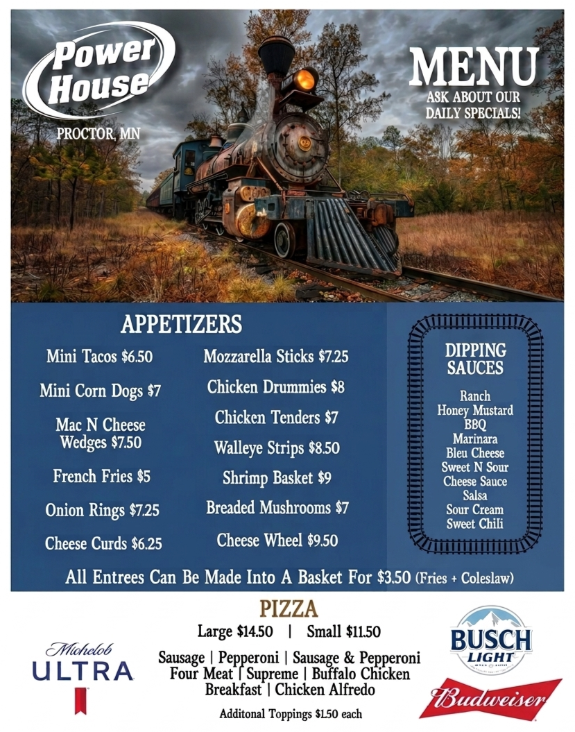 Welcome to Powerhouse Bar! We are a full-service bar located in historic Proctor, Minnesota. Not only do we offer great drinks and specials; We offer pizza and other short-order selections such as: Sandwiches, Chicken Strips and Wings.